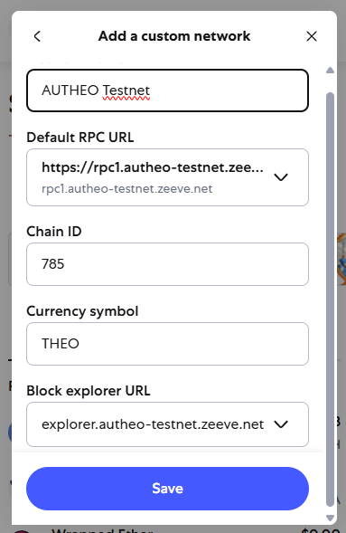 - Default RPC URL: https://rpc1.autheo-testnet.zeeve.net and https://rpc2.autheo-testnet.zeeve.net